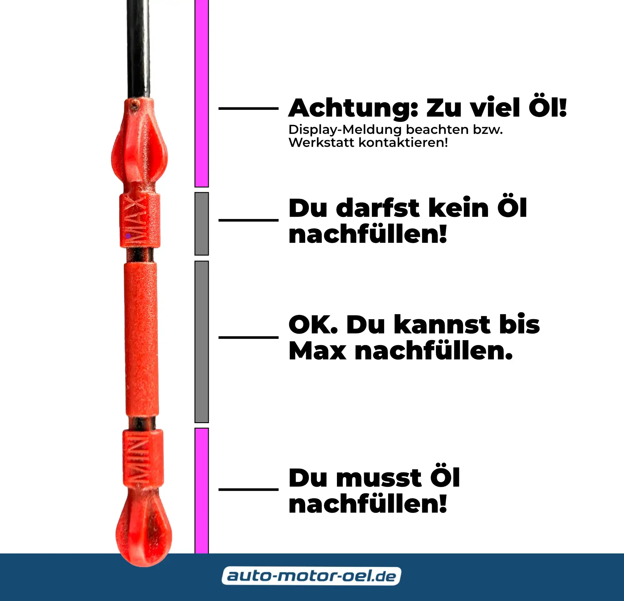 Liegt der Ölstand unterhalb der Min-Markierung des Peilstabes oder zeigt dir dein Bordcomputer an, dass du Öl nachfüllen sollst, musst du Folgendes beachten: